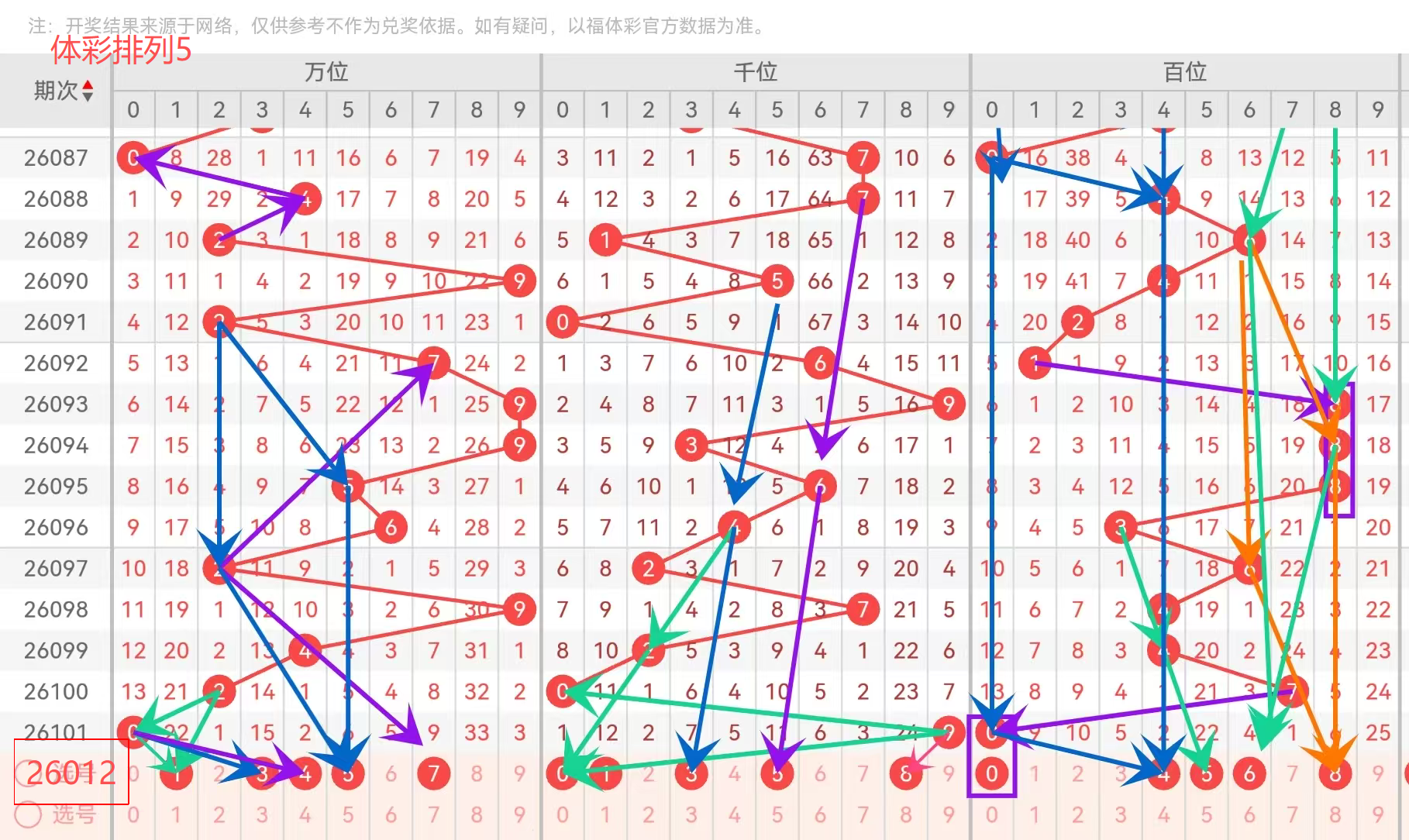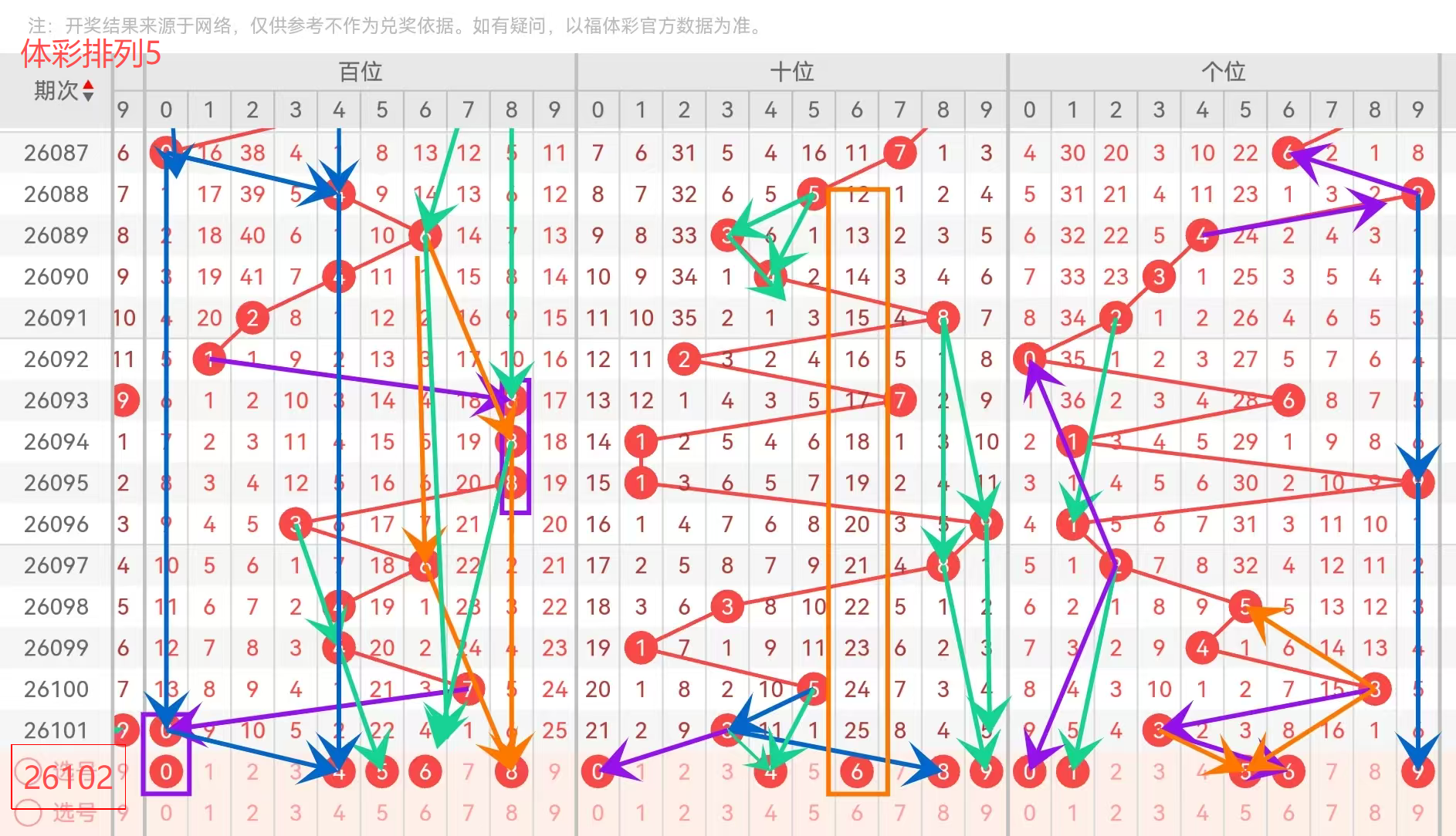 百位近期走势:百位上期开0,有些人觉得不会连着出,但我觉得有时候号码就爱重复,这个得防。4 和 5 是偶数里的代表,而且位置不扎眼,时不时出一下。6 是上上期开过的号,有些人会防它重复开。8 是你留的唯一一个大数,估计是怕百位一下子掉到小号去。我觉得你这个思路,杀 1、2、3 杀得挺坚决的,我也觉得 1、2、3 连着开了那么多次,特别是 0 和 4,都是小号,而且最近百位开 0,是个小号,接下来往小号走的可能性比较大。6 和 8 可以稍微往后放放观察。