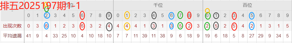 下图所圈出的为近30期各位置所出现的热码出现次数及平均遗漏值,用以参考和一些冷码组合选号。