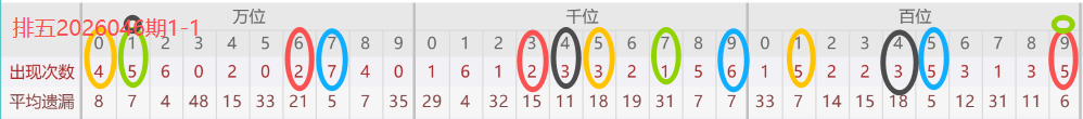 下图所圈出的为近30期各位置所出现的热码出现次数及平均遗漏值,用以参考和一些冷码组合选号。