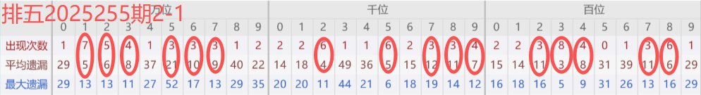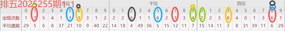 下图所圈出的为近30期各位置所出现的热码出现次数及平均遗漏值,用以参考和一些冷码组合选号。