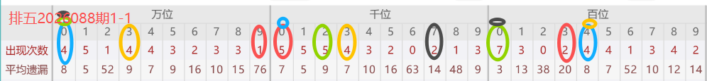 下图所圈出的为近30期各位置所出现的热码出现次数及平均遗漏值,用以参考和一些冷码组合选号。