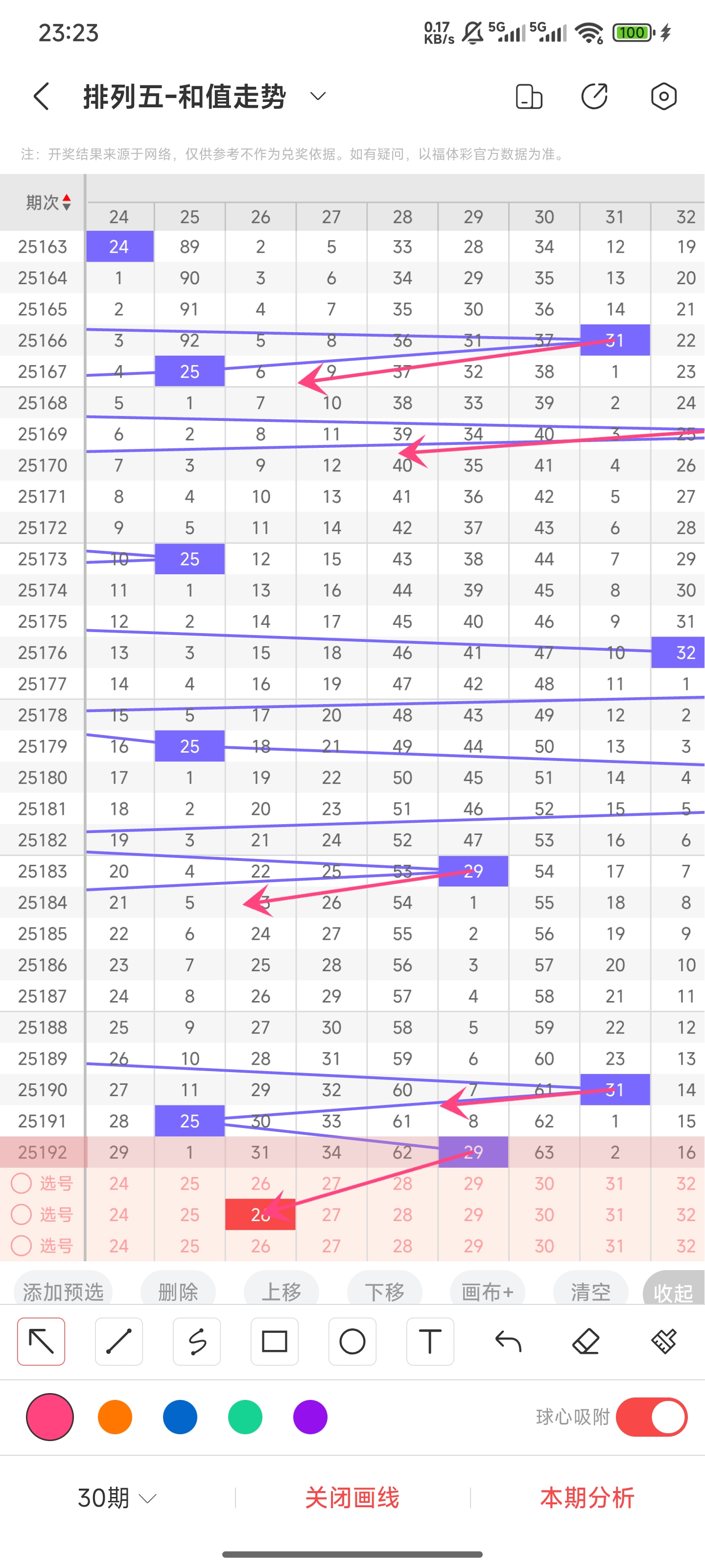 上期和值为29,往前一期和值为25,向右偏移了4个点位。29是一个中等偏上一点的和值,增长的空间比减少的空间小一点。但结合走势图和历史相同和值或者接近和值时,趋势是往左的。所以推测本期大概率是往左移动的,比较的小概率继续往右。
