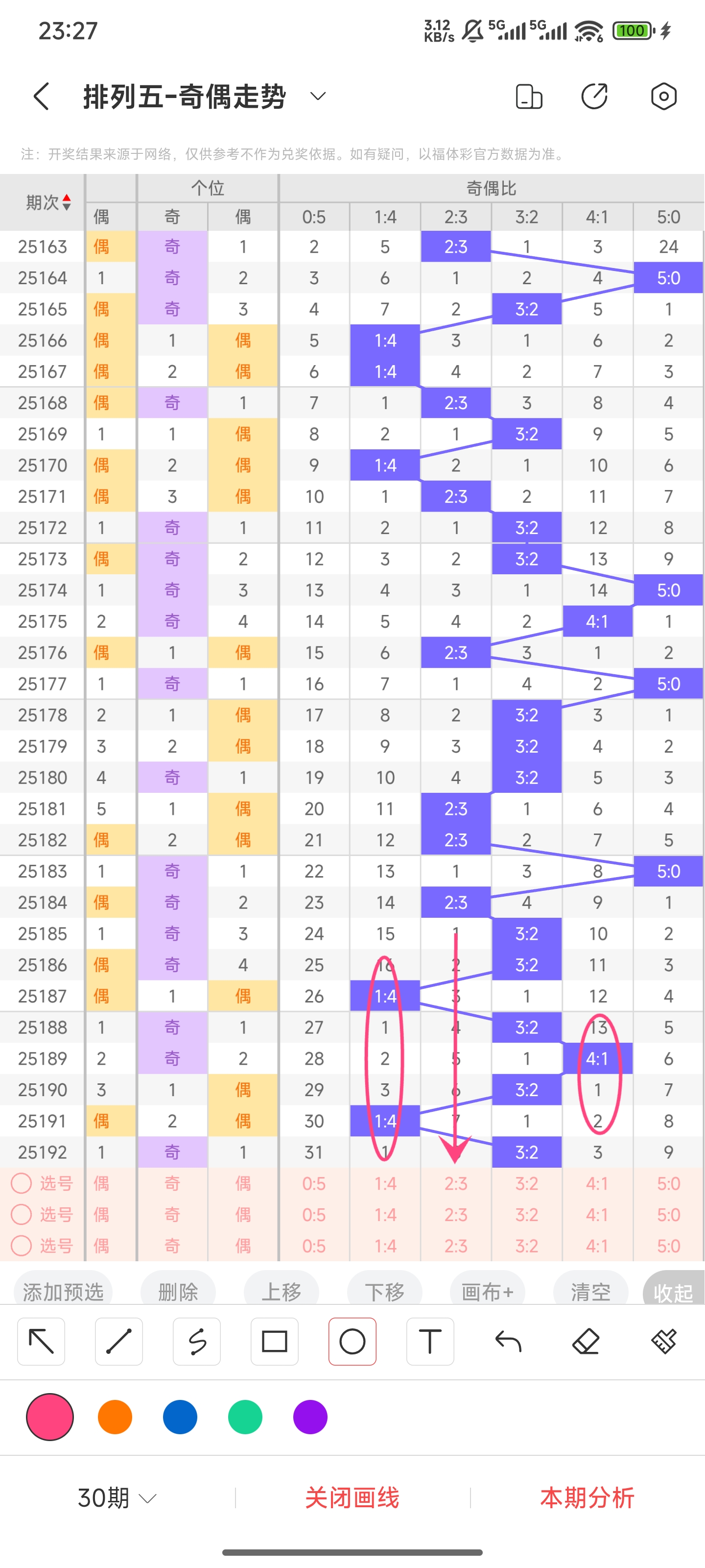 上期开出了3:2的奇偶比,分别为偶偶奇奇奇。往前一期为1:4,最近1:4奇偶比和4:1奇偶比都有回归。而2:3奇偶比已经遗漏8期了,差不多可能要回归了。所以本期大概率开出2:3奇偶比,小概率依然开出3:2奇偶比。