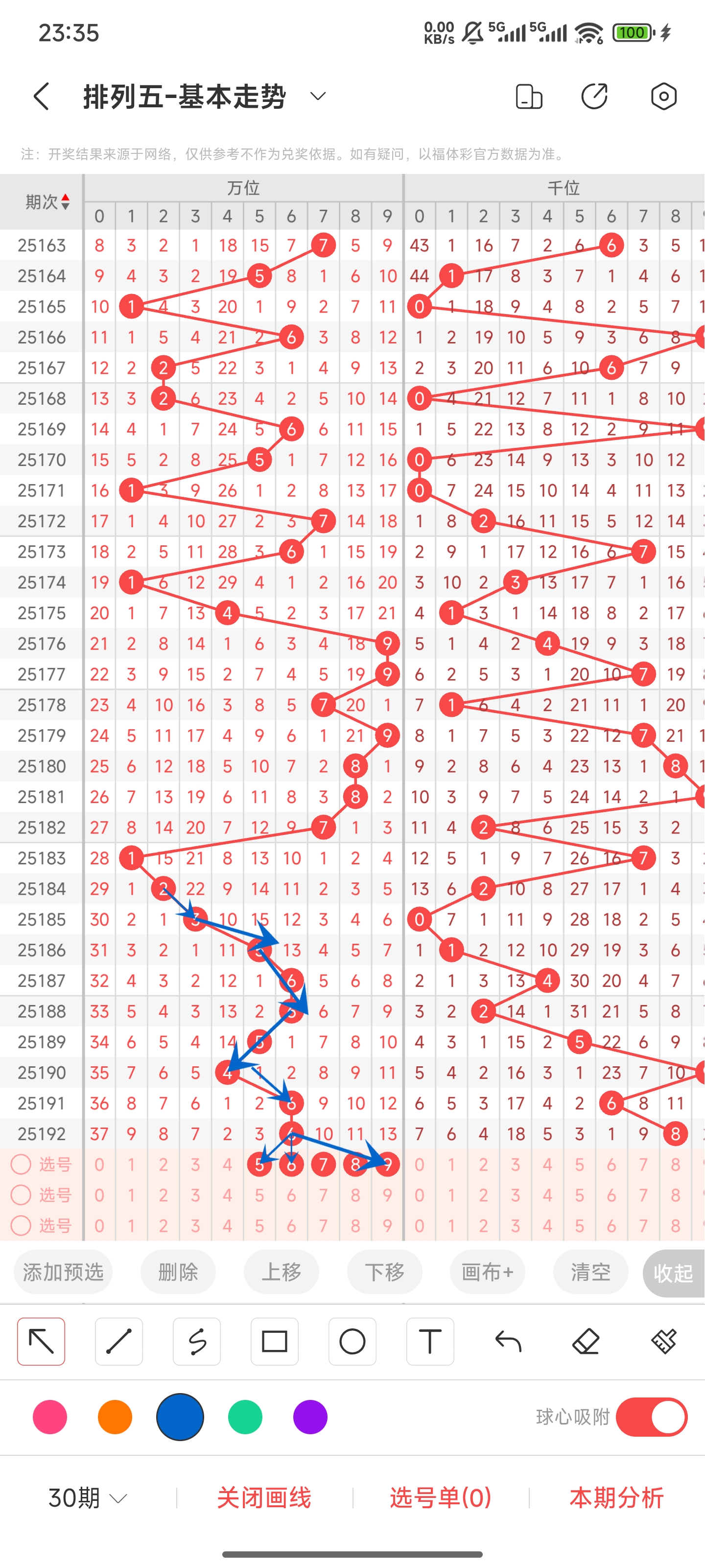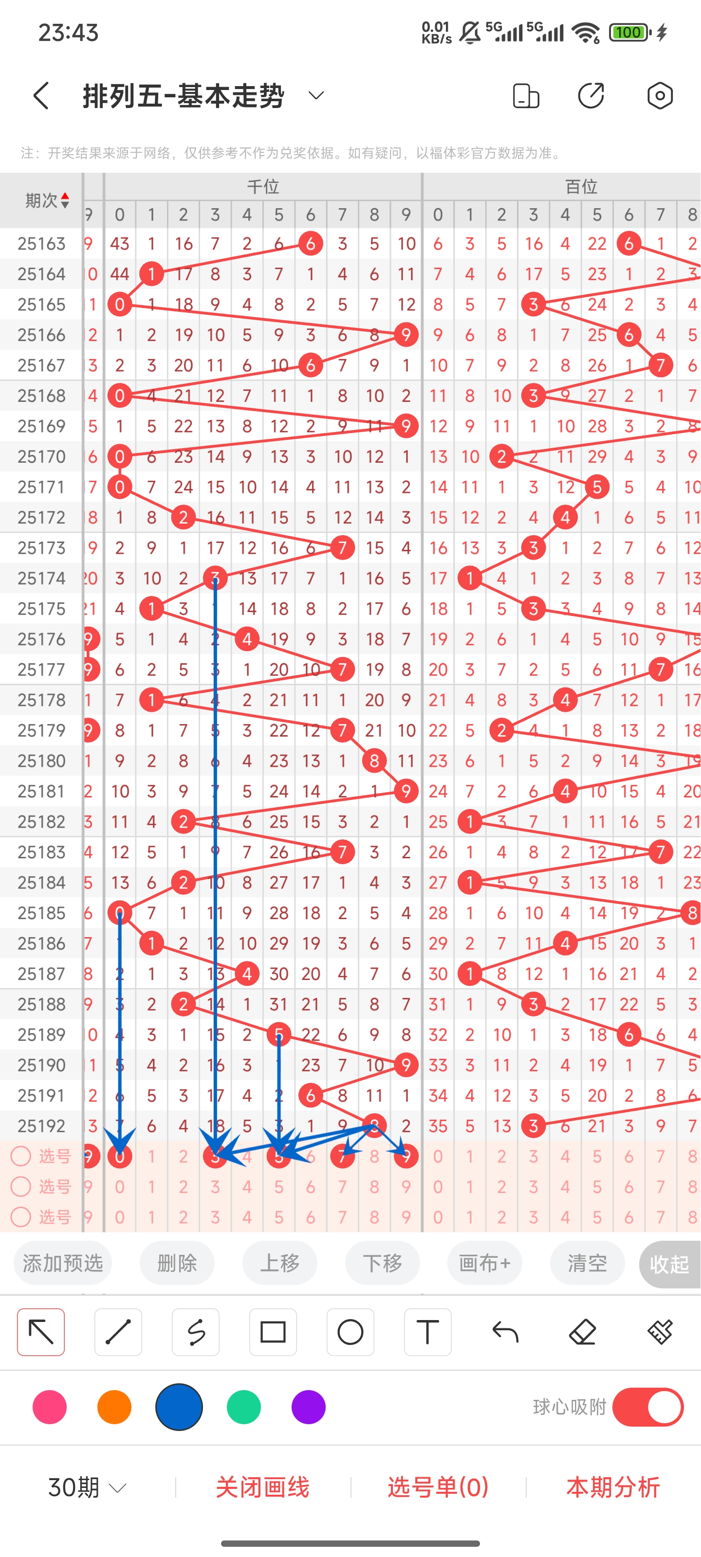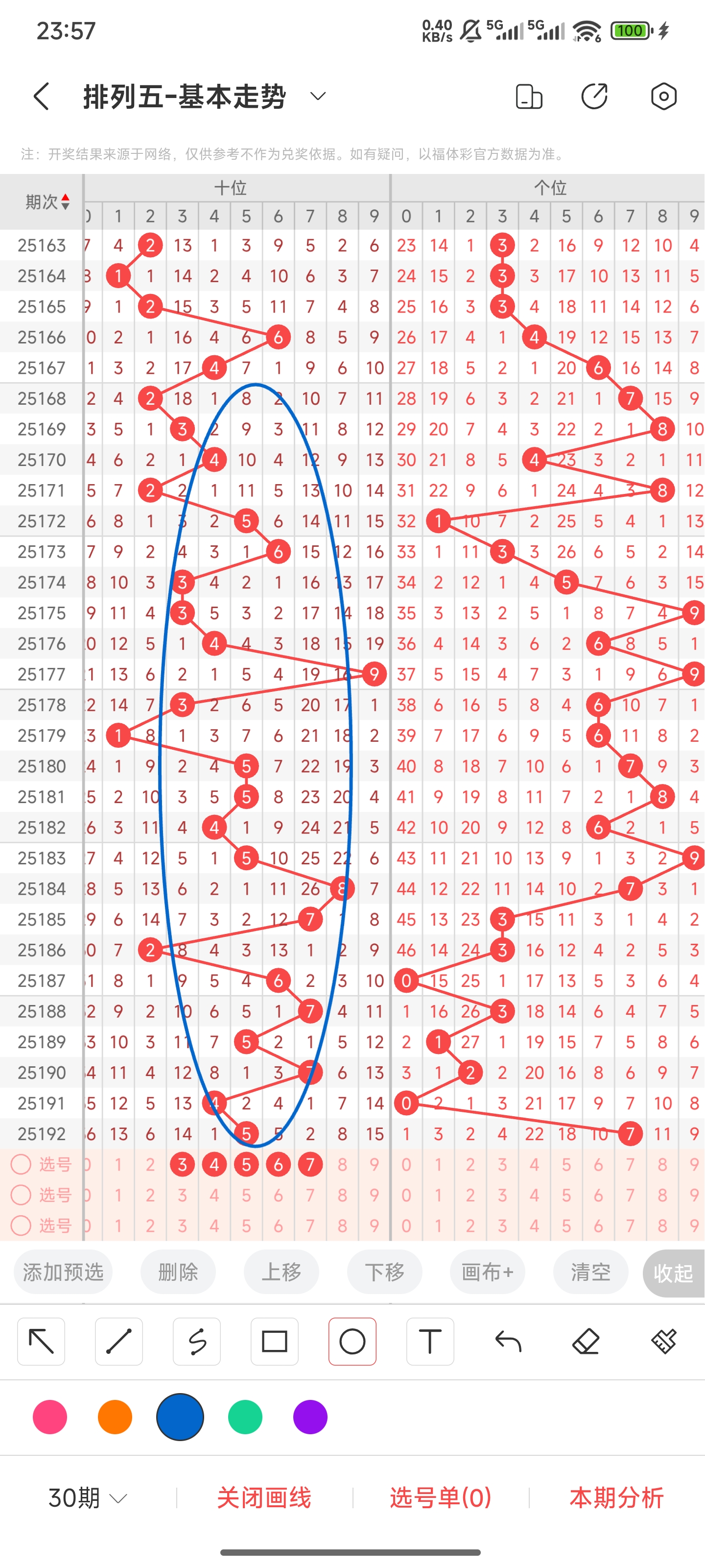 上期开的是0,往前一期开出的是07。上期是进行了比较大的偏移。但通过分析走势图和历史号码趋势,本期大概率走势会比较平缓。可以关注05,06和08,09。又因为07比较热门可以考虑连出。所以本期推测可能开出05,06,07,08,09等号码。