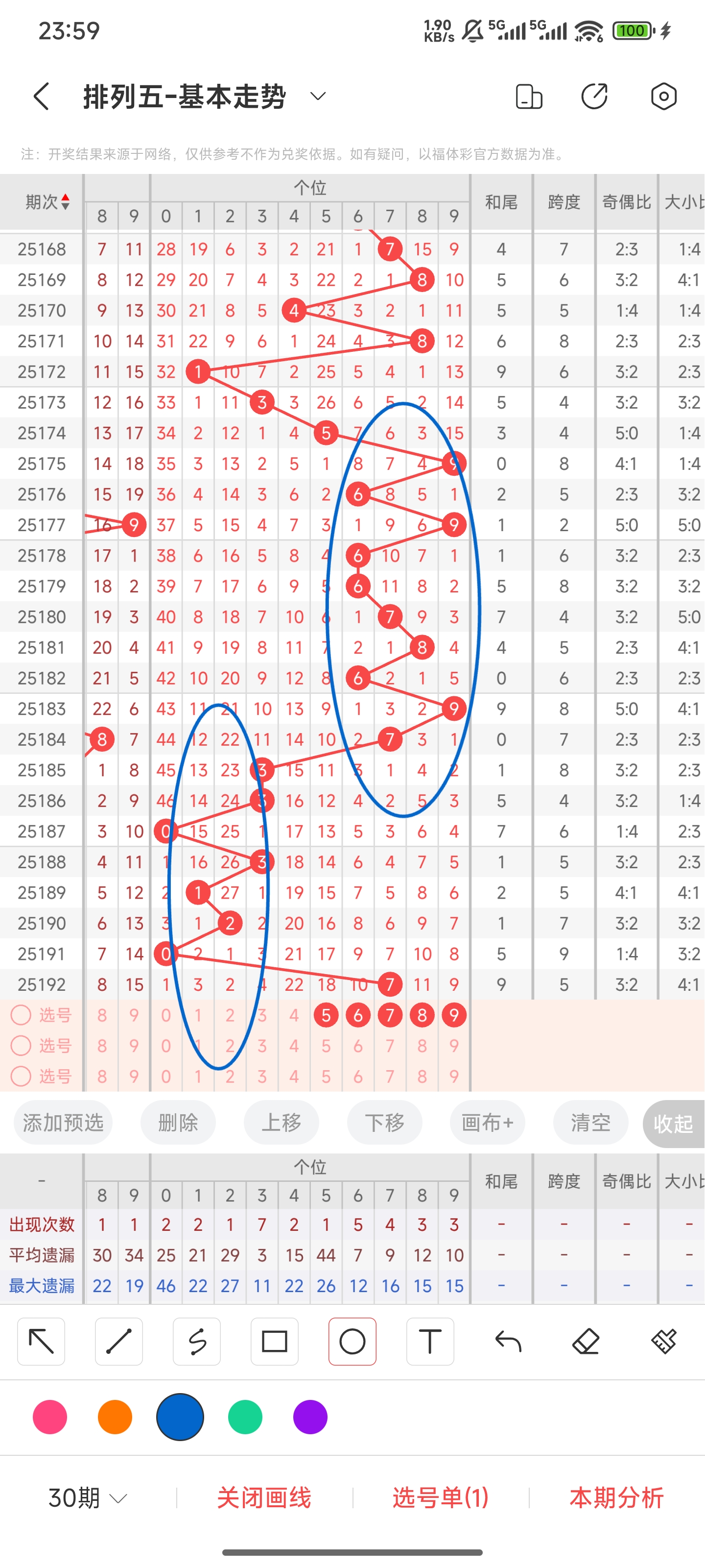 先回顾一下上期情况,开出68357,和尾为9,跨度为5,奇偶比为3:2,大小比为4:1,012路个数对比为2:1:2。