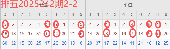 2025238期开奖号码75455,万位近30期7出现5次数 ,千位近30期5出现5次数(较241期减一),百位近30期4出现3次数 ,十位近30期5出现5次数 (减位回补),个位近30期5出现4次数 (较240期减一)。