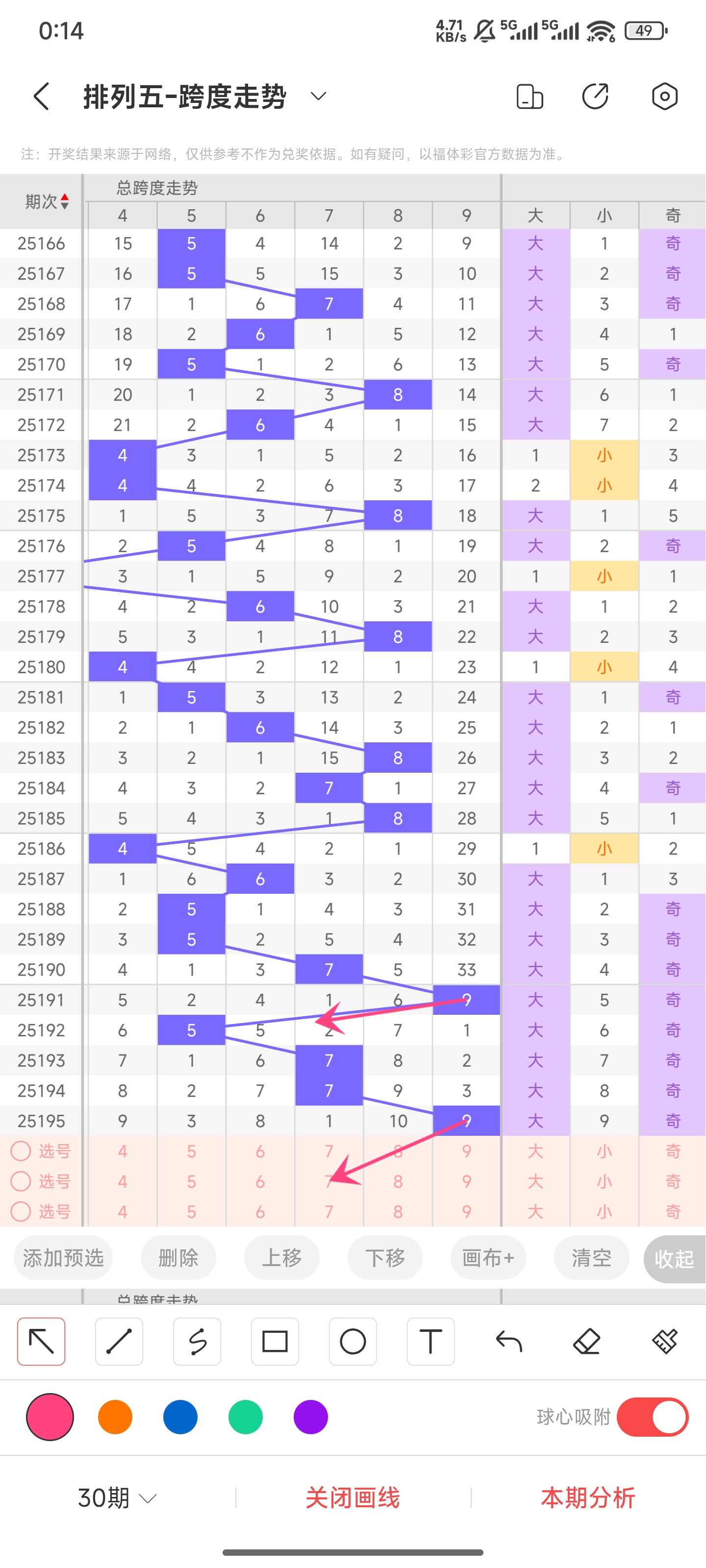 上期跨度为9,往前一期跨度是7,跨度往右增大。跨度9已经是最大的了,结合近30期数据,到达跨度9后一般不会连出一样的跨度。所以本期趋势应该是往左下降的,所以推测本期跨度可能为45678等跨度。