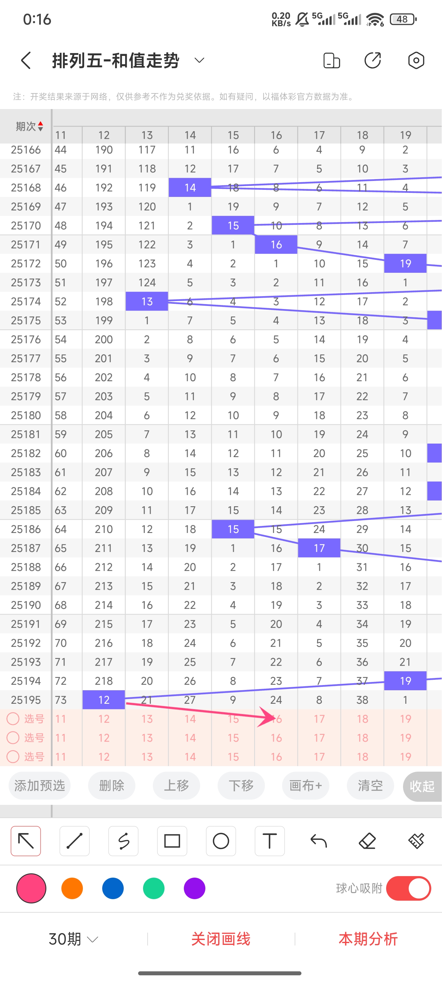 上期和值为12,往前一期和值为19,向左偏移了7个点位。12是目前30期内开过的最小和值了,基本上不会再下降了。结合走势图趋势,本期趋势应该是往右走的了,和值会增大。