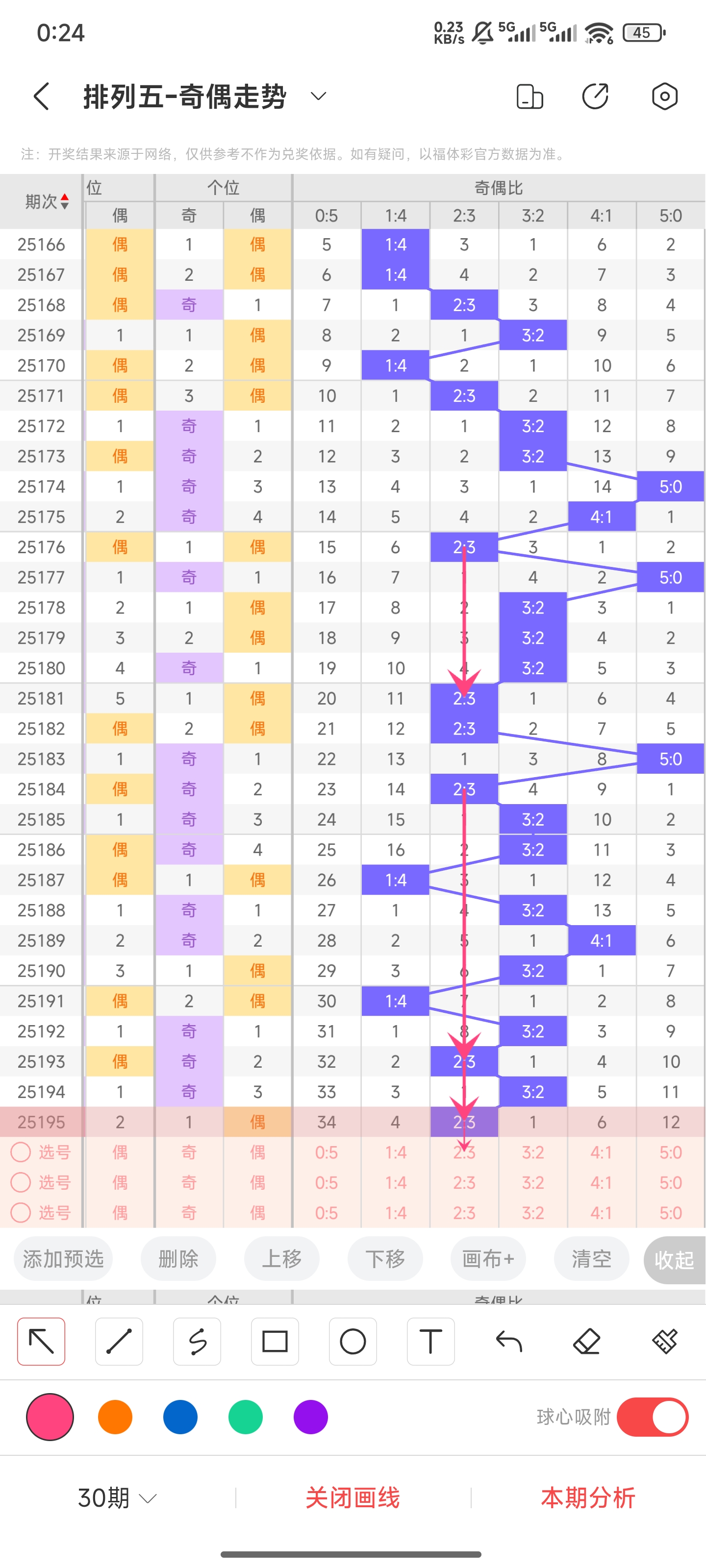 上期开出了2:3的奇偶比,分别为偶奇偶奇偶。往前一期为3:2。通过分析目前30期数据,开出4:1奇偶比的概率是6.66%,开出1:4奇偶比的概率是16.66%,开出3:2奇偶比的概率为40%,开出2:3奇偶比的概率为26.66%,开出全奇的概率为10%,开出全偶的概率是0。从理论上讲开出2:3奇偶比和开出3:2奇偶比应该是一样的,那么本期就可能继续1开出2:3奇偶比,好让概率趋近一致。