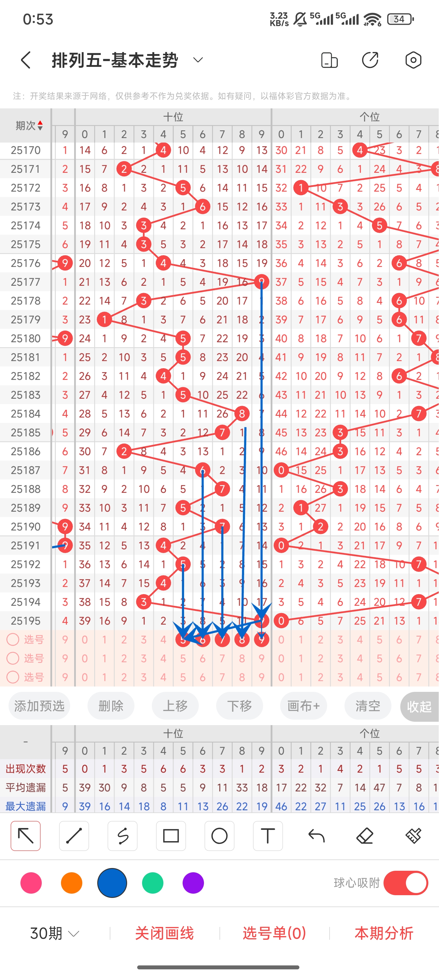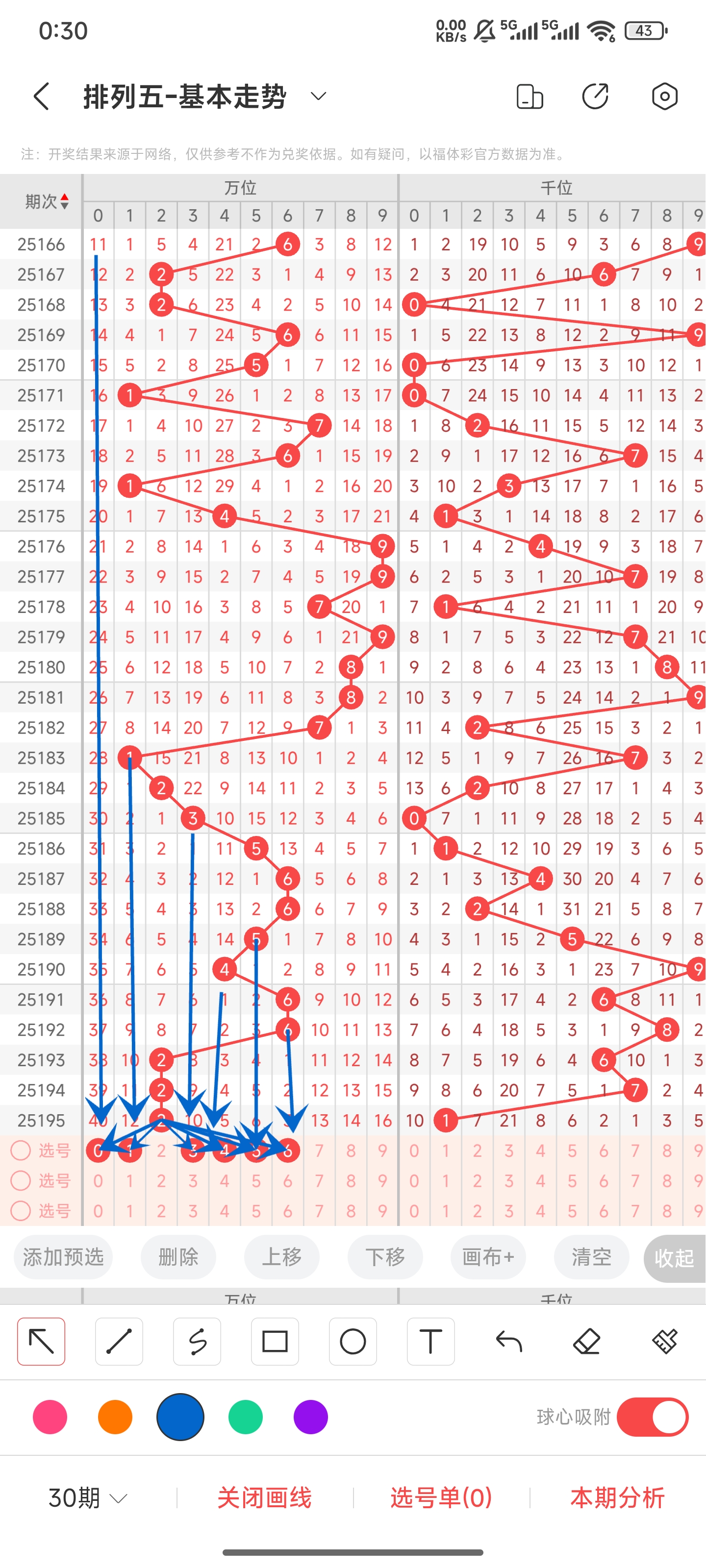 上期开的是0,往前一期开出的是07。0是目前比较冷门的号码,最近10期已经回归了三期,所以不考虑连出。通过走势图我们可以看到最近几期的走势突然变得很陡了。那么本期我们除了取一些比较平缓的数字外,还要注意下比较陡的号码。可以关注01,03,04,05,06。所以本期推测可能开出01,03,04,05,06等号码。