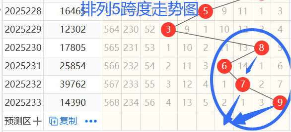 依次是38679跨度,按照012路的排序是02010路跨度,后面两期不是同路跨度,根据路数转换关系来看,本期0 1路跨度,那么跨度我们暂定369147跨,个人比较看好6 9 跨度