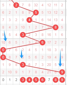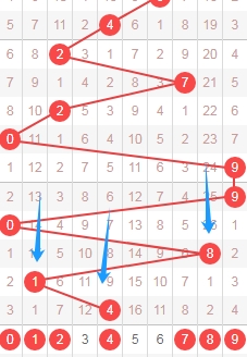 上图是体彩排列五从左到右定位第五位数字,我标注出来的蓝色箭头表示遗漏周期,上期开出数字9遗漏周期是10期,上面出现的遗漏中区都在10期以上,那么本期可以关注出遗漏周期小的数字345689,个人最看好数字35689。