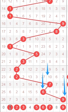 上图是体彩排列五从左到右定位第二位数字,我标注出来的蓝色箭头表示遗漏周期,上期开出数字4遗漏周期是9期,上上期开出数字1遗漏周期15期,那么本期可以关注出遗漏周期小的数字0124789;个人最看好数字01478。