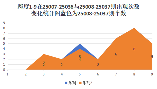 图中我作图并没有考略像00000这种5同号,特殊的不能在特殊,很难遇到,共10组。根据我做的图知道,图中2个区间图形不重合,图中跨度5是在30期内(25007-25036与25008-25037)区间出现的次数分别是5次和4次,图中跨度3是在30期内(25007-25036与25008-25037)区间出现的次数分别是2次和3次,根据一起彩30期(25008-25037)内跨度走势图知道下一期少的跨度是9,因为知道减少得跨度5是2路号,增加得跨度3是0路号,下一期减少的跨度9是0路号,2期比较减少得跨度在不同路上,分析知道下期不会在出现增多的0路号。也就是跨度组合杀掉0,3,6,9,至此我们会得到一组缩水号码。接下来根据一起彩排列五走势图分析各个位可能落得号。