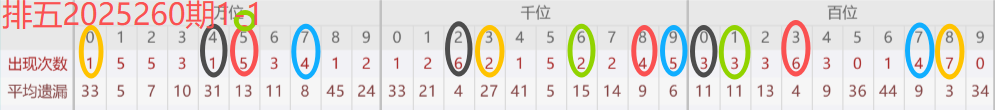 下图所圈出的为近30期各位置所出现的热码出现次数及平均遗漏值,用以参考和一些冷码组合选号。