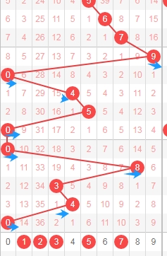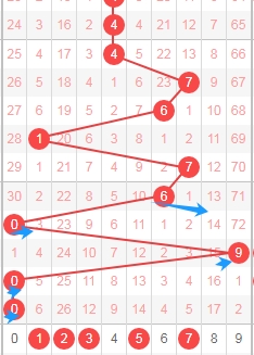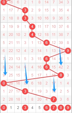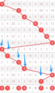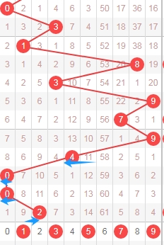 上图是体彩排列五从左到右定位第四位,我标志出来的蓝色小箭头表示遗漏周期,上期开出数字7遗漏周期是7期,根据这些蓝色箭头分析,本期可以关注出遗漏周期小的数字013479,个人最看好数字03479。
