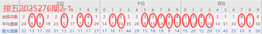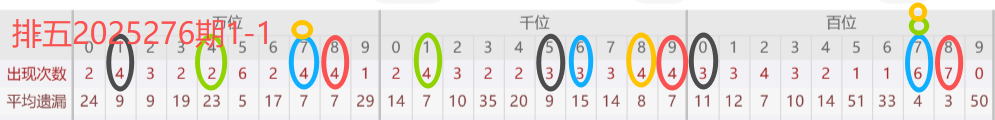 下图所圈出的为近30期各位置所出现的热码出现次数及平均遗漏值,用以参考和一些冷码组合选号。