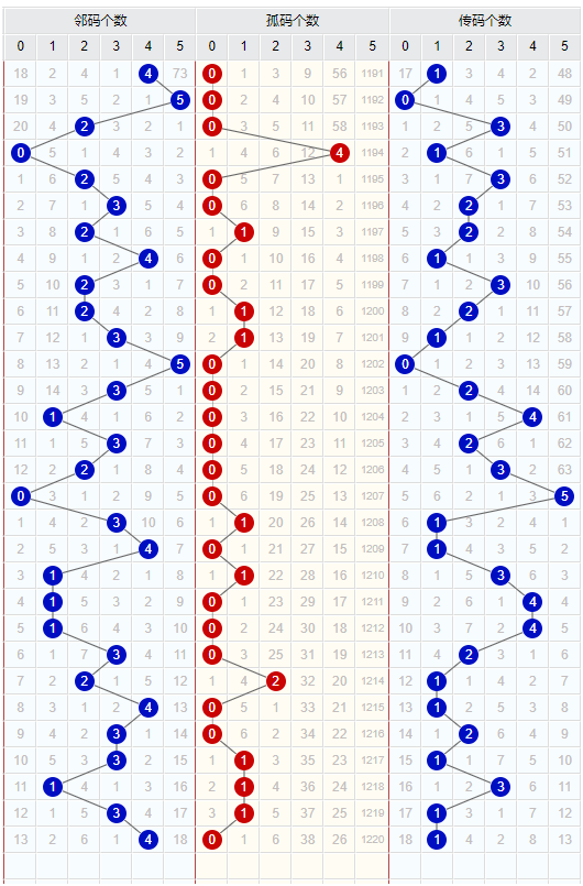 很多朋友会问了,什么是邻传孤?这个指标我们首先要简单的介绍下所谓的邻传孤:传码是指和上期的号相同的号,邻码是指和上期的号相邻的号,其它则是孤码。比如上期排5开奖号码是11768,那么下期的邻码就是0259,传码就是1679,孤码就是34,这就是所谓的邻传孤的概念。
