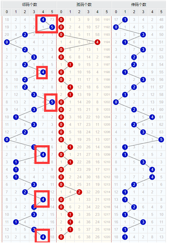 我们此时关注邻码,我们看到每当邻码开出4个或者5个的时候,下一期再次开出4个或者5个邻码的可能性大大降低了,这也就是告诉我们,一旦使用邻码,就要关注邻码开出的数字比较多的数字比如4和5,一旦开出了4和5,那么下一期就必须排除邻码再次出现4和5的情况,这样的绞杀很难失手成功概率大的惊人,希望大家能学习使用这样的办法。