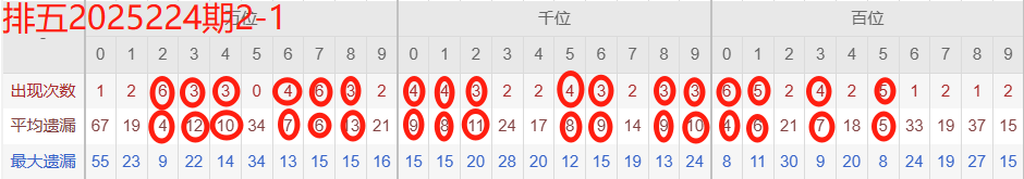 下图所圈出的为近30期各位置所出现的热码出现次数及平均遗漏值,用以参考和一些冷码组合选号。