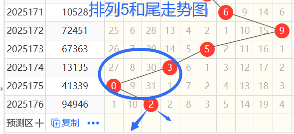 1)我们来看和尾,以172期——176期为例,如图依次是95302和尾,按照012路排序是02002路和尾,后面两期不是同路,今天就是0路或1路的和尾,为什么这么讲呢,这个是个大概率的问题,也是根据长期的研究规律定的,准确率相当高,我们定了0 1路的和尾,也就是0369147和尾,那么我们再来看和值,按照和值除3余数的话,可以分为余0 1 2路. 那么我们来看172期和值19余1,173期和值25余1,174期和值13余1,175期和值20余2,176期和值32余2,结合路数关系来讲,所以和值可余0和余1,结合上面的和尾的话就只有0369258尾, 这几个尾数。和值的话就是10 13 16 19 21 24 27 30 33 36 39 这几个和值。