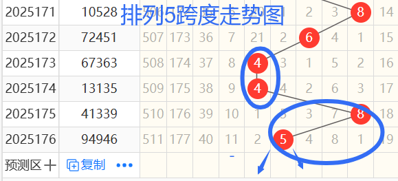2)我们来看跨度,以172期——176期为例,如图依次是64485跨度,按照012路的排序是01122路跨度,后面两期是同路跨度,根据路数转换关系来看,本期0 1路跨度,那么跨度我们暂定0369147跨,个人比较看好4 6跨度