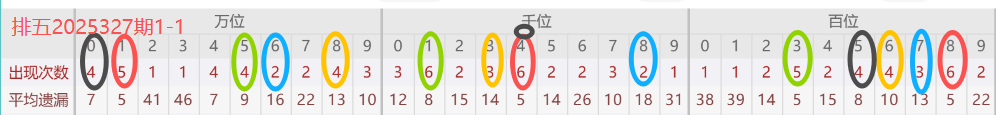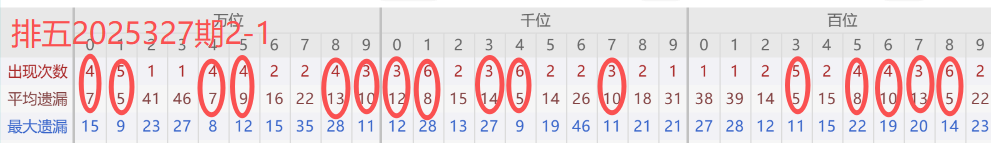 下图所圈出的为近30期各位置所出现的热码出现次数及平均遗漏值,用以参考和一些冷码组合选号。