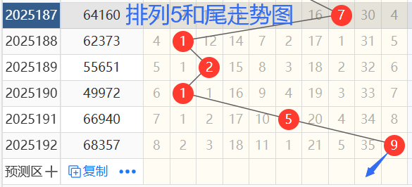 1)我们来看和尾,以188期——192期为例,如图依次是12159和尾,按照012路排序是12120路和尾,后面两期不是同路,今天就是2路或0路的和尾,为什么这么讲呢,这个是个大概率的问题,也是根据长期的研究规律定的,准确率相当高,我们定了2 0路的和尾,也就是2580369和尾,那么我们再来看和值,按照和值除3余数的话,可以分为余0 1 2路. 那么我们来看188期和值21余0,189期和值22余1,190期和值31余1,191期和值25余1,192期和值29余2,结合路数关系来讲,所以和值可余0和余1,结合上面的和尾的话就只有0369258尾, 这几个尾数。和值的话就是20 23 26 29 12 15 18 22 25 28 10 13 16 19这几个和值。