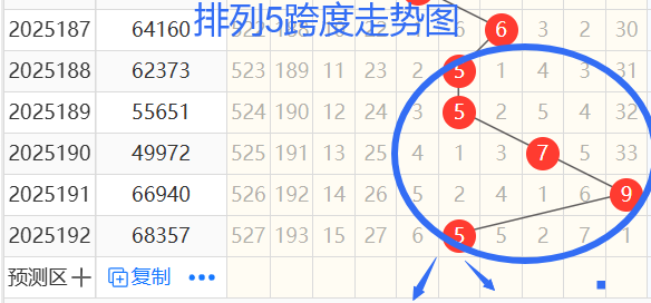 2)我们来看跨度,以188期——192期为例,如图依次是55795跨度,按照012路的排序是22102路跨度,后面两期不是同路跨度,根据路数转换关系来看,本期0 2路跨度,那么跨度我们暂定2580369跨,个人比较看好 4 6跨度