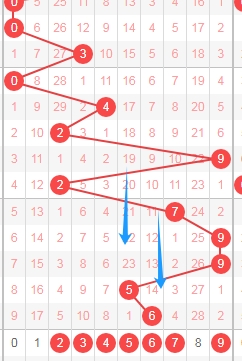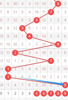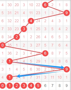 上图是体彩排列五从左到右定位第四位数字,我标注出来蓝色箭头表示走势跨度,上期开出数字9走势跨度是8,从数字1到数字9是跨度8,那么本期可以关注出跨度小的数字56789,个人最看好数字5678。