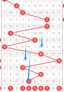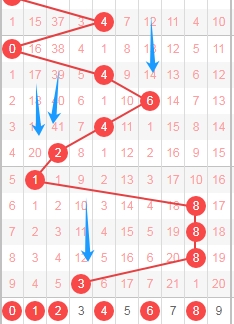 上图是体彩排列五从左到右定位第三位数字,我标注出来蓝色箭头表示遗漏周期,上期开出数字3遗漏周期是12期,前面数字2遗漏周期是41期,那么本期第三位数字可以关注出遗漏周期小的数字012468,个人最看好数字0246。