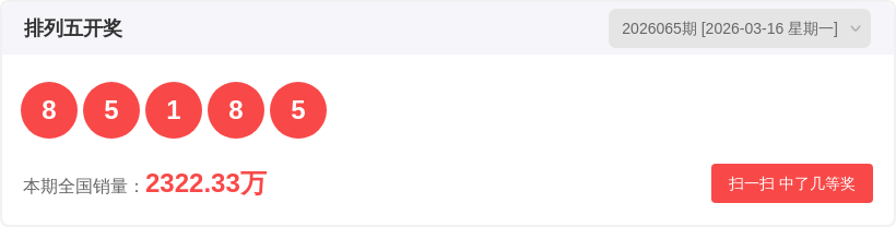 排列526065期开奖结果8 5 1 8 5,和值27,和值尾7,质合比3:2,奇偶比3:2。