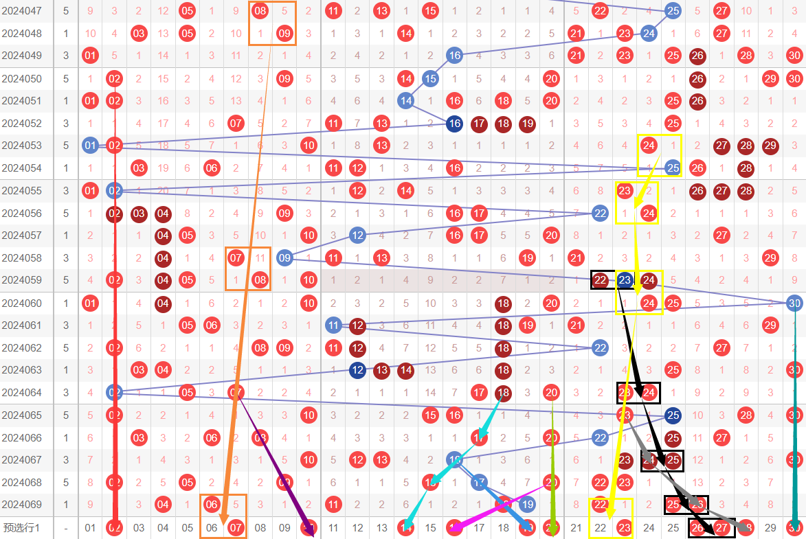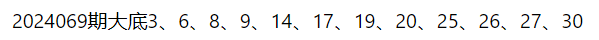 开奖号码符合2024069期和值三选一中的③选完7个号码后,加一起为109~135