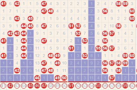 第三区间最近再走下降走势,上期开出4个号码,本期应该在3~4码左右;这个区间的号码这期应该零散出号,首先今天关注45 46 47三个号码,45号球作为47~46~45的三斜连号码,加上41~43~45的加持,会不会顺势而下呢。46号球作为冷号开出,本期大概率会进行回补;其次是55 59两个号码球要关注;接下来的42和45选择一枚即可。