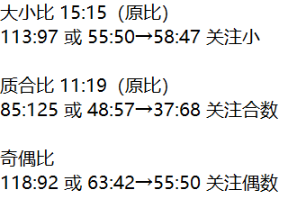 将大小比、质合比、奇偶比近10期和近10期每5期对比列出,本期考虑关注小数,关注合数,关注偶数