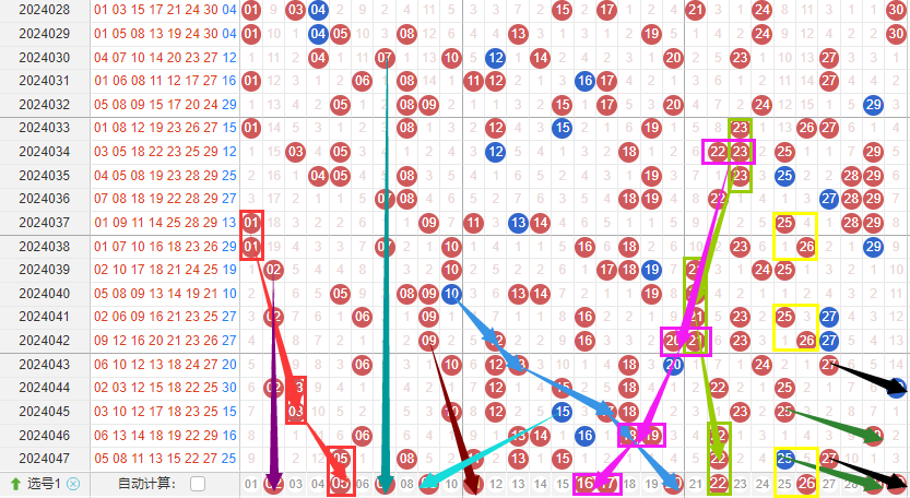 开奖号码符合2024047期和值三选一的①选项:①选完7个号码后,加一起为82~108