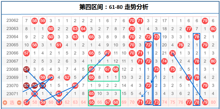 上期的四区思路还是正确的,做空配合防守,本期的四区依旧不是很好看,虽然有些形态号码可以做出来,但是还是要强调一下风险,不如在四区观察一期走势后再出手。对称形态号码还是要慎重。后半区的规律号码特别多,冷态号码也是较多,所以在这个位置做号真的就是走势+运气了,如果有选择后半区做号的,还是要查一下遗漏周期,以及其他的一些数据,来降低做号风险。