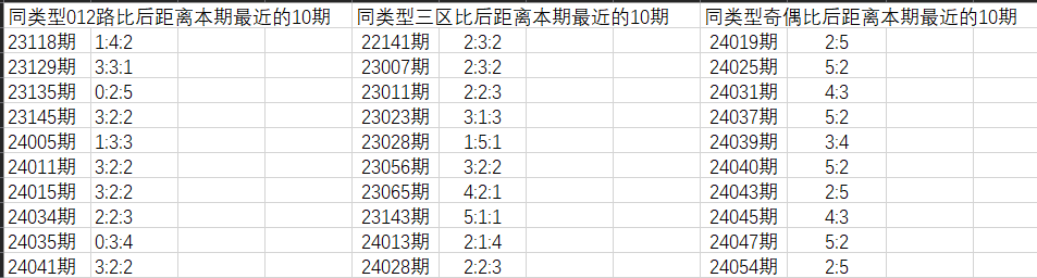 将符合上期的012路、三区比、奇偶比最近10期找出,列出它们下一期的012路、三区比、奇偶比