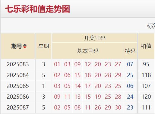 近五期七乐彩开奖号码和值依次为95→118→107→120→111。周期和值均值为110。周期和值振幅为25,周期和值修正振幅为18。基于动态平衡干预以及波动趋势衡量,本期开奖和值推测区间为92-128。基于风险对冲策略,本期开奖和值区间缩水为95-126。