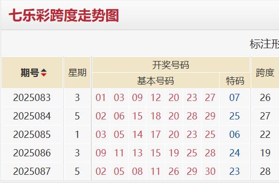 近五期七乐彩开奖号码跨度依次为26→27→22→19→28。周期跨度均值为24。周期跨度振幅为9。周期修正跨度振幅为6。基于动态平衡干预以及波动趋势衡量,本期开奖跨度推测区间为18-30。基于风险对冲策略,本期开奖跨度区间缩水为20-29。