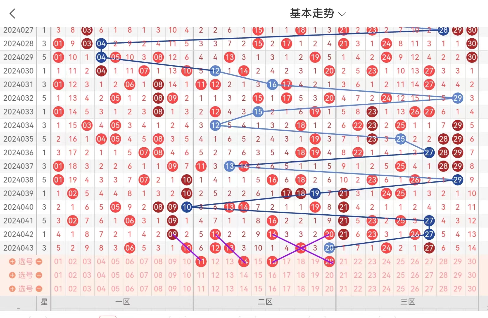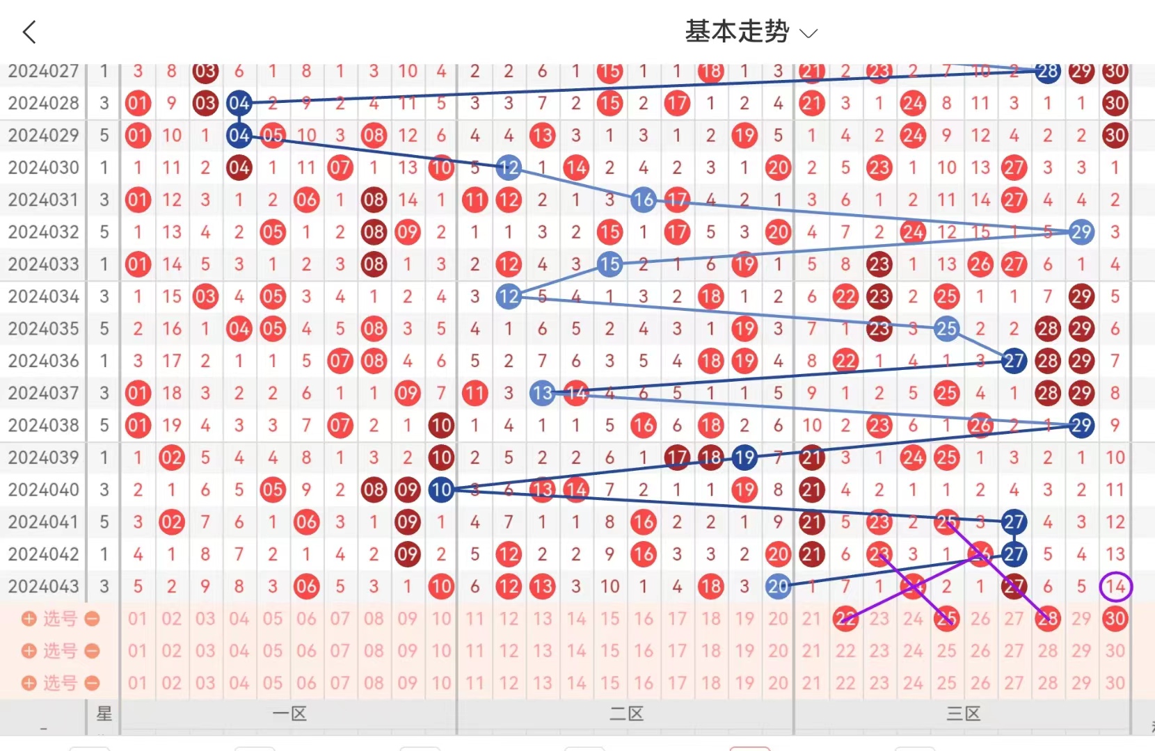 三区间上期(2024043期)开出了两码24-27,开出了分边号码和重号,本期做号需要注意斜连走势号码和重号能否继续开出,从近期该区间上开出的三重号来看,在2024036期开出重号后下期走出了四重,在2024037期开出三重号后下期重号分了边,在2024041期开出三重号下期重号开出了四重,本期重号位置号码需要仔细研判考虑,本期首先需要关注的号码【22】隔空斜连走势,然后是【25】三斜连走势号码,其次是【28】和【30】其中28重号六期回补带四斜连走势,30遗漏十四期冷号带隔空斜连走势,本期重点关注号码【22 25 28 30】