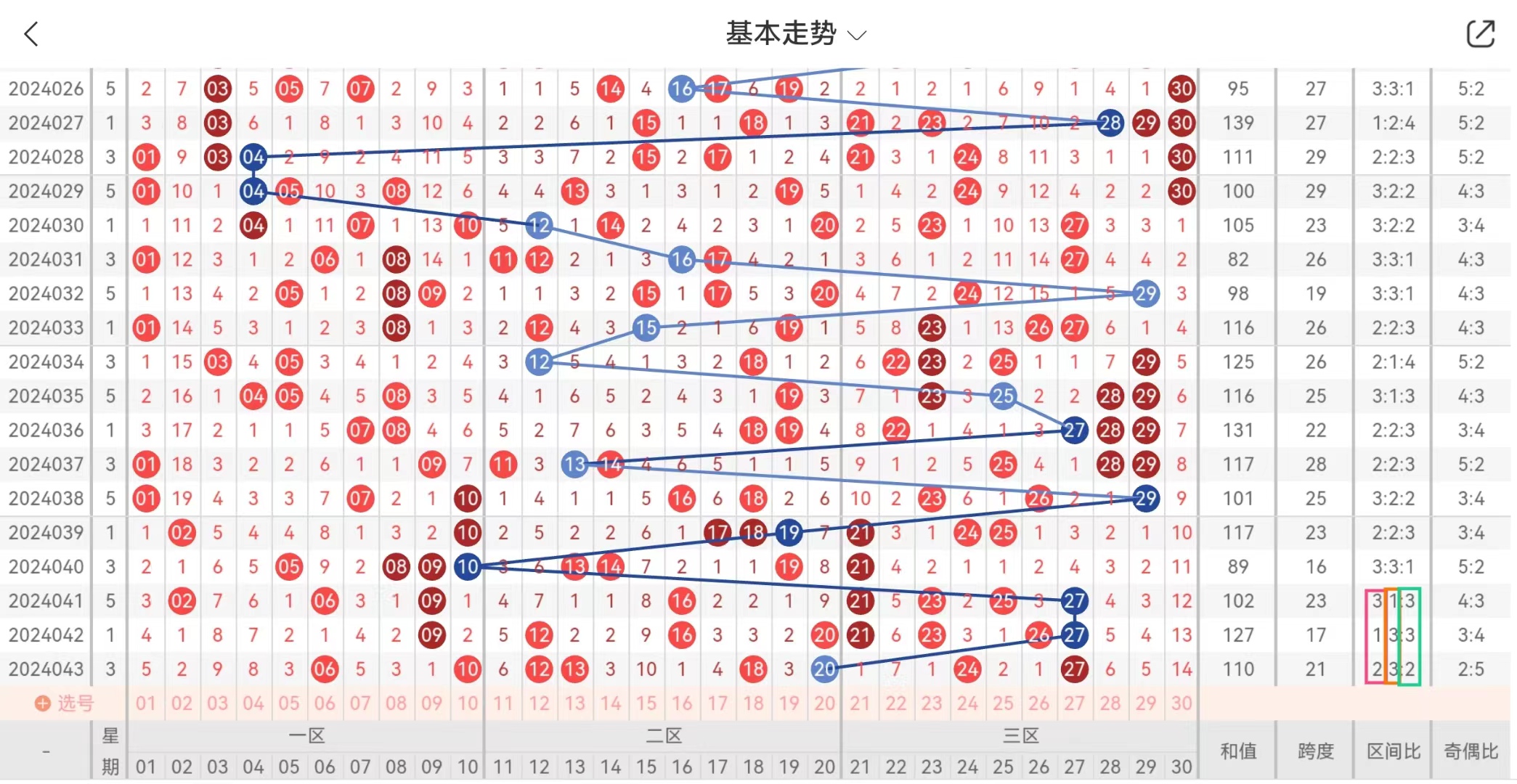 上期(2024043期)奇偶比2:5 区间比2:3:2