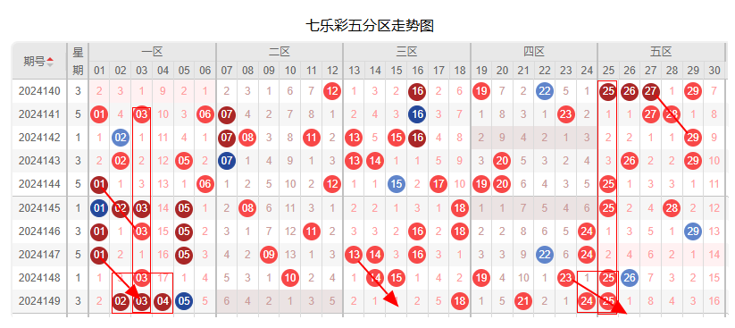 五区(25 - 30):五区开出号码25,五区上期开出1个号码,近10期断层2次,其中25近期开出期数较多。推荐关注号码:26、28、29、30。
