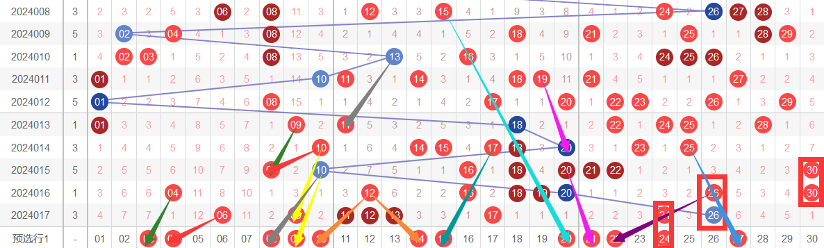 走向用各种颜色的标记画出,按照1~10,11~20,20~30三个区域看走势,跨区域走势考虑较少但必须存在作为防御