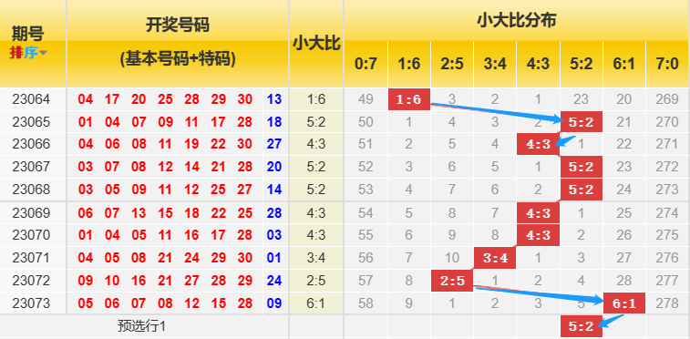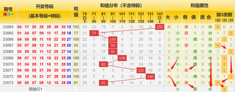 根据和值属性,上期为大、奇、合。近十期大小比为3:7,虽然大数连开2期,但总体小数占优且有回补趋势,故取小数;近十期奇偶比为5:5,奇数上期如预测一样开出,短期进入交替,故本期看回补偶数;近十期质合比为0:10,合数绝对优势,已经突破短期极值向历史极值进军,所以本期需防合数;除三012路近五期1路开出3次,2路开出1次,0路1次,0、2路进入多空平衡,1路绝对优势,所以本期我们要防1路;和值尾数近三期走出1-0-1来回波动走势,预计本期有同值波动可能,故和值尾数为0。综上所述和值预计范围在71-80间,如果一定要定一个准确和值,我们根据上面属性分析和值为80。