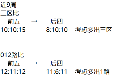 将012路比、三区比近9周(周一)的前五周和后四周对比列出,本期考虑在三区多出号,1路多出号