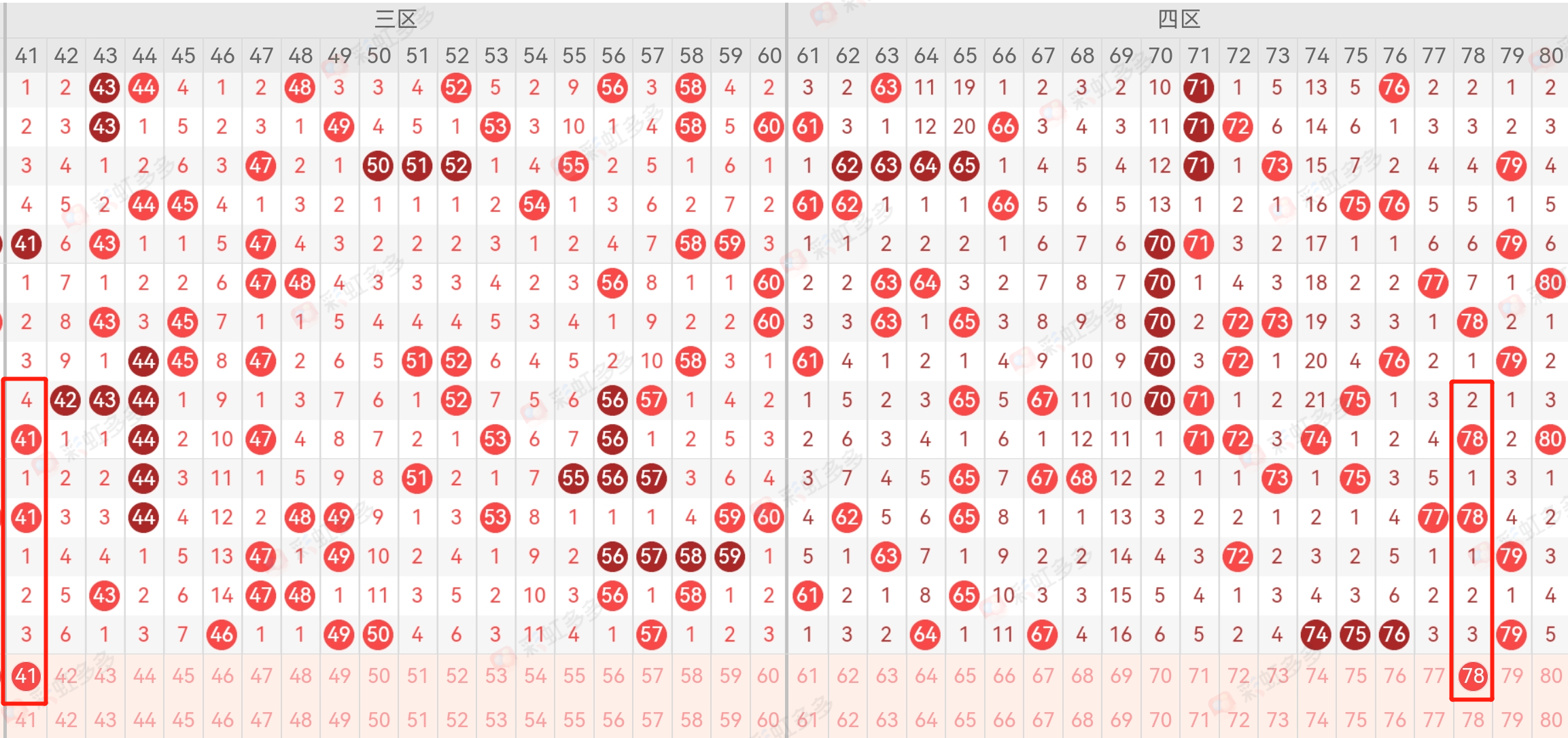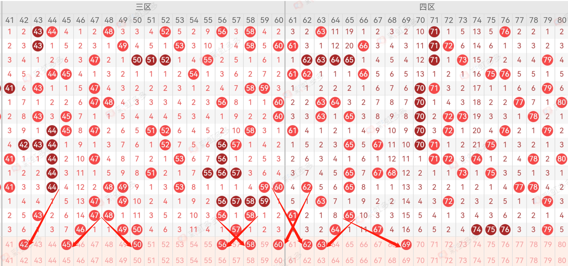 综合以上四区号码的分析我们可以得出:(04.05.07.08.18.24.25.26.28.30.31.35.39.40.41.42.45.50.56.58.60.62.63.69.78)共计二十五枚号码可以作为本期的关注范围。