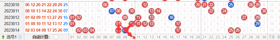 8、9、10与9、10、11形成了相差一期的平行线,且红球8和蓝球9组成了一条斜线,与2023011~2023013的8、9、10斜线同起点(08),因此考虑下一期斜线继续延伸,即10出现的可能性,对于09,红球9和蓝球9间隔一期且蓝球9与本期无间隔。因此考虑9出现的可能性。对于08,因8、9、10与9、10、11形成了相差一期的平行线,其中一条斜线经由蓝球9延伸至本期,且08出现了二连重号,因此也考虑08出现的可能