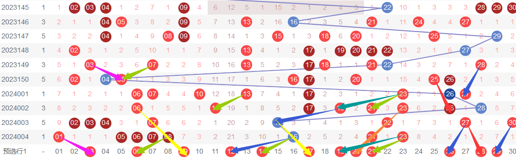 走向用各种颜色的标记画出,按照1~10,11~20,20~30三个区域看走势,跨区域走势考虑较少但必须存在作为防御