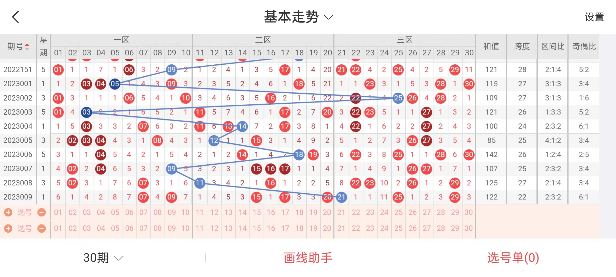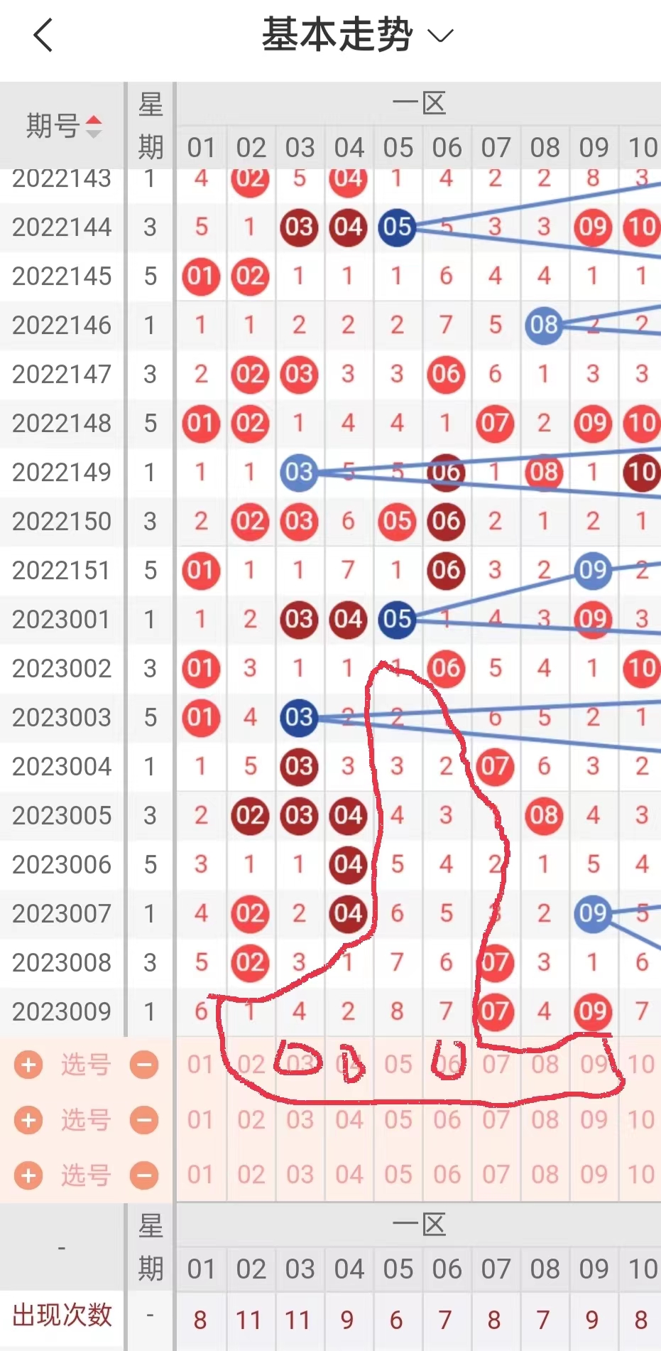 一区号码上期开出07.09,两个都是单数,从图中看,我画了一个不规则的圈,圈里的号码就是我认为下期一区会开出号码的范围,号码08开出的话会形成一个倒三角,号码02开出的话规律太正了,号码05.06是一区的两个冷号,开的话出其一的可能性高,然后上期又都是单数号码,本期我会重点考虑双数号码,所以本期一区号码可关注03.04.06。